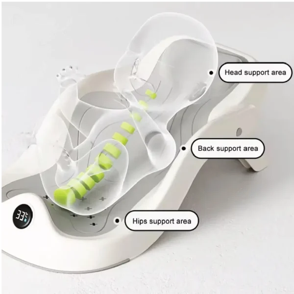 এই বাথ সিটে থাকা তাপমাত্রা সংবেদনশীল সেন্সর পানির তাপমাত্রা নিরাপদ কিনা তা বুঝতে সাহায্য করে। নরম TPR মেশ ম্যাট শিশুর কোমল ত্বককে রক্ষা করে এবং দ্রুত পানি ঝরিয়ে দেয়, ফলে ছত্রাক বা দুর্গন্ধ হওয়ার আশঙ্কা থাকে না।